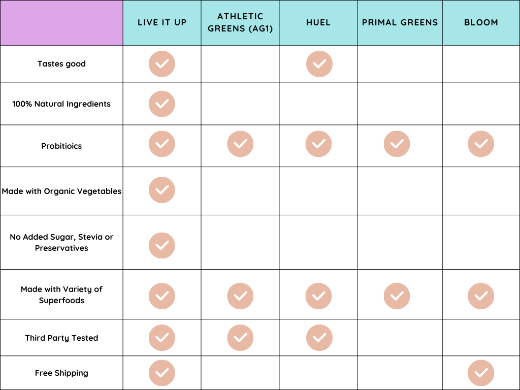 Live it Up checked all of my boxes. It has a wide range of high quality nutritious ingredients with multiple health benefits, from energy to digestion to immunity, it actually tastes delicious (like a smoothie with fresh mint) and has a very competitive price.